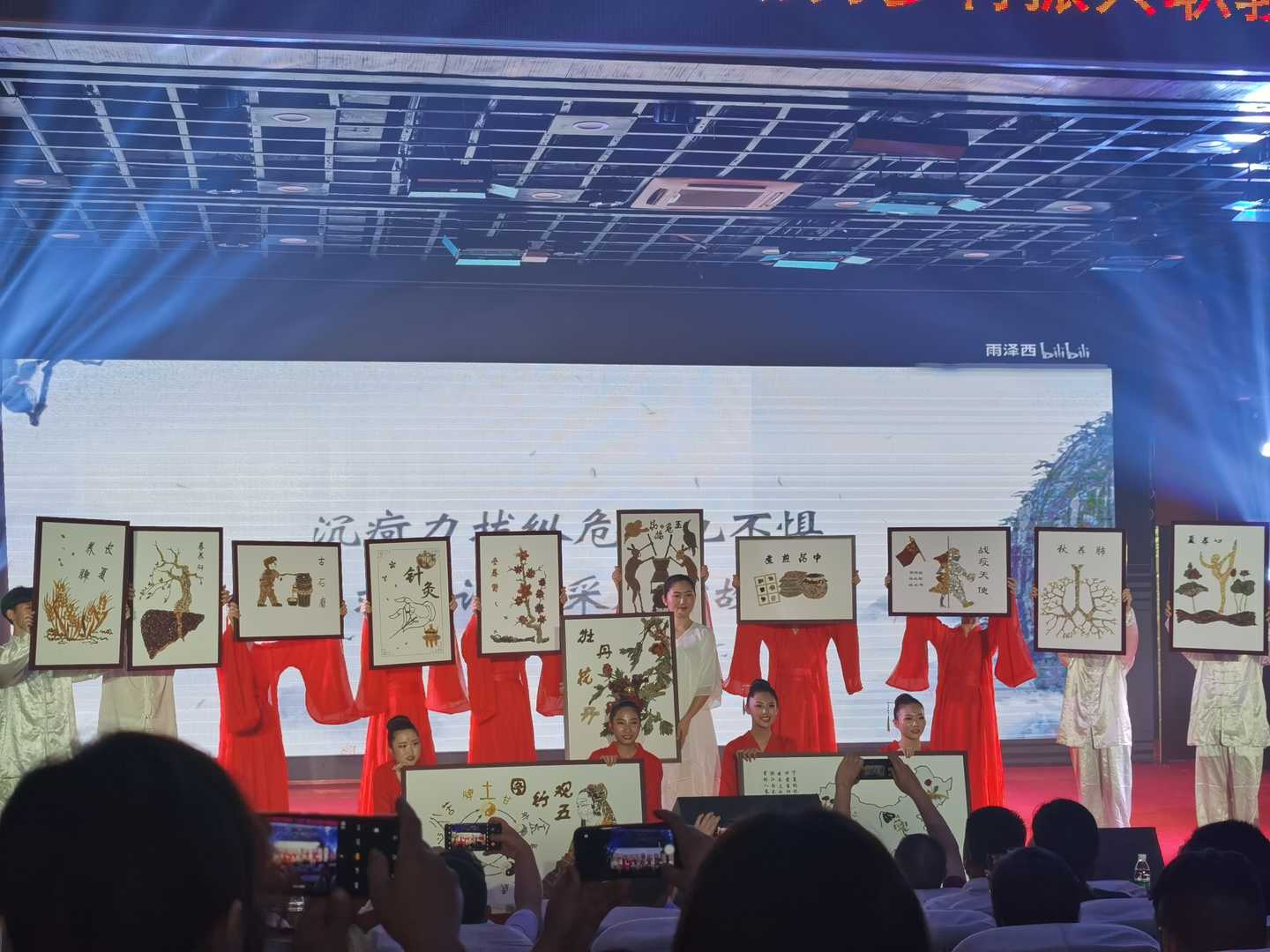 为传承中医学、中药学文化精髓,充分展现中医药文化元素,晚会上我校参演节目选取人参、蜈蚣、木蝴蝶、羌活鱼等常见药材二百余味,引药入画,制作药灵图。