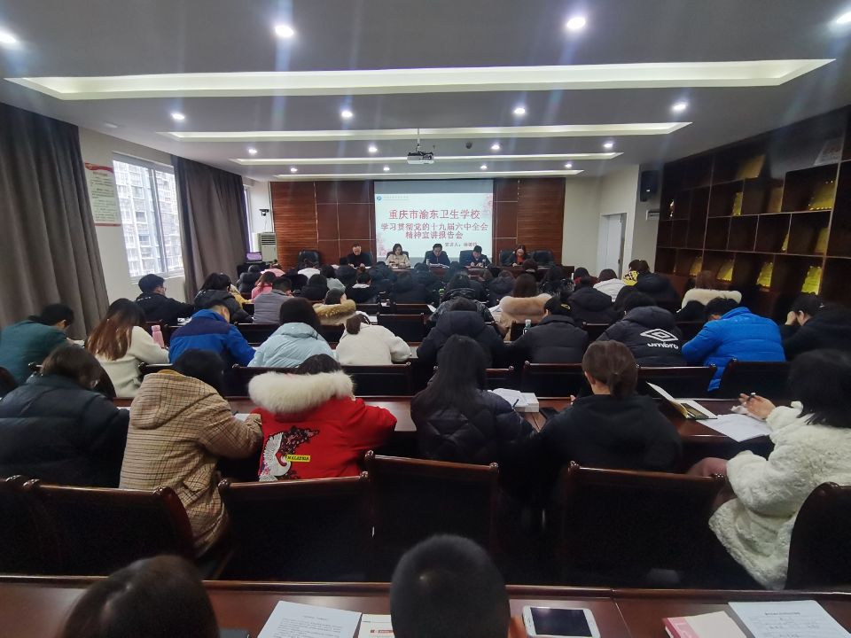 为持续推进党的十九届六中全会精神在学校教师中走深走实,2022年1月20日,渝东卫校学习贯彻党的十九届六中全会精神宣讲报告会在学校八楼二会议室举行。报告会由党委书记杨德钱主持并讲话,全校81名干部职工参加。