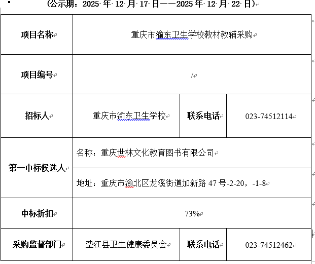 重庆市渝东卫生学校 教材教辅采购中标结果公示